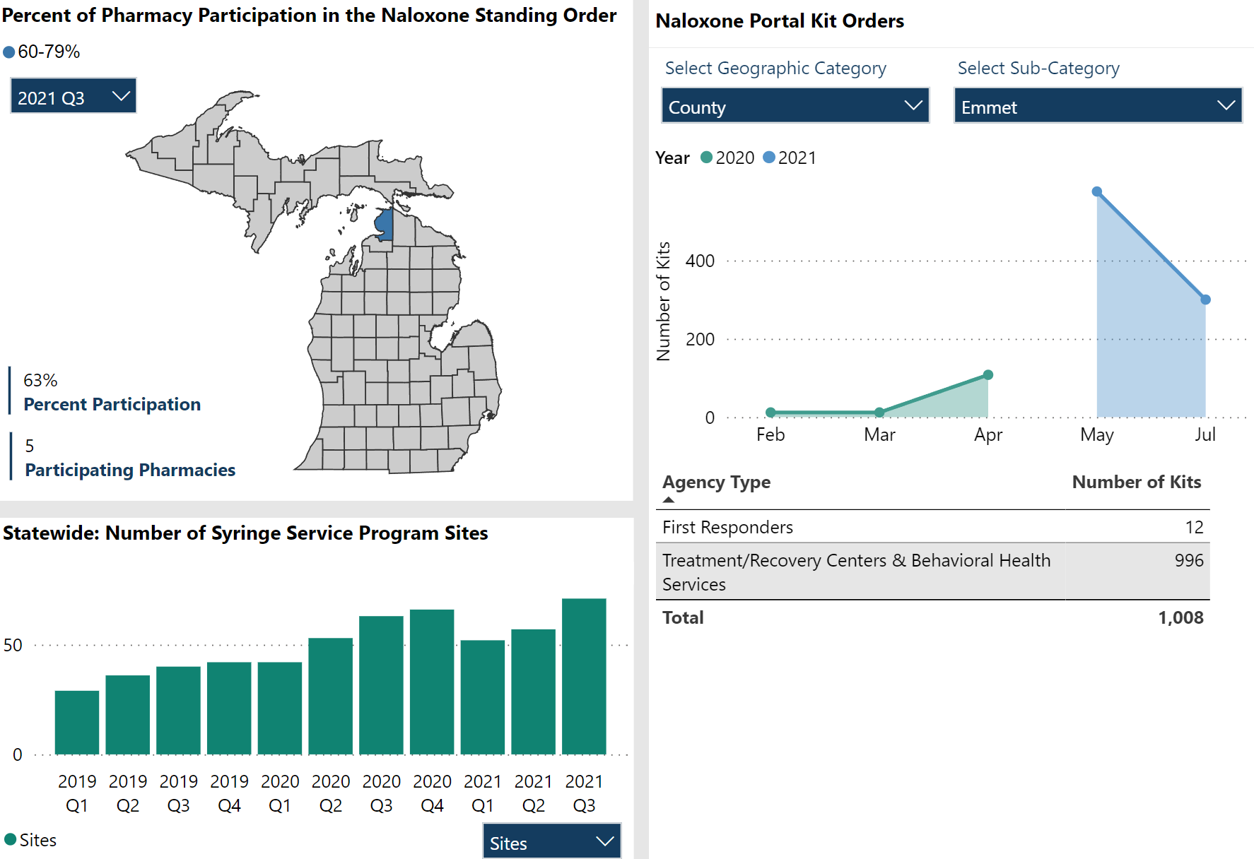 Technical Note: The Percent of Pharmacies Participating in the Naloxone Standing Order indicator represents the percent of licensed pharmacies in Michigan that are registered to dispense naloxone, a medication used to reverse opioid overdose, under the standing order policy issued by the Michigan Department of Health and Human Services (MDHHS). Data is sourced from the Environmental Health Surveillance Section, MDHHS.